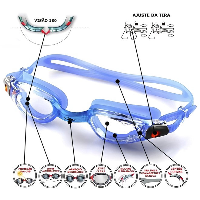· Composição: Lente: PC, Junta: Silicone, Tiras: Silicone