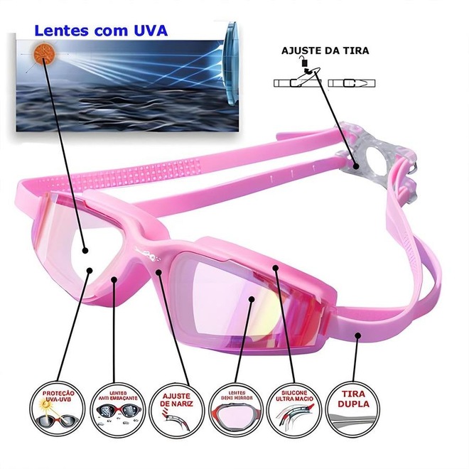 * Possui um frame com gasckets projetado em design 3D impedindo a entrada de água e se adequa a qualquer rosto. Perfeito para natação.