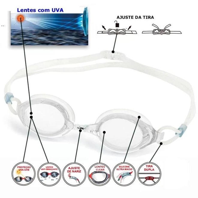 Óculos De Natação Gold Sports Velocity de silicone macio que reduz a pressão no rosto e garante um ajuste ideal você não precisa se preocupar com sua vedação, e você pode verificar o conforto ajustando a faixa de cabeça.
