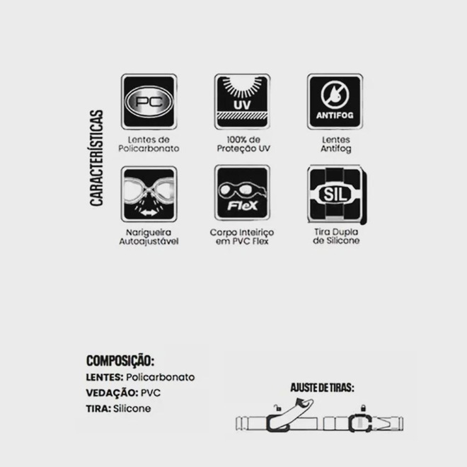 Composição: Lentes 100% Policarbonato; Tiras 100% Silicone; Vedação 100% PVC;