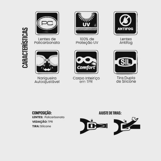Composição: Lentes 100% Policarbonato; Tiras 100% Silicone; Vedação 100% TPR (Borracha Termoplástica);