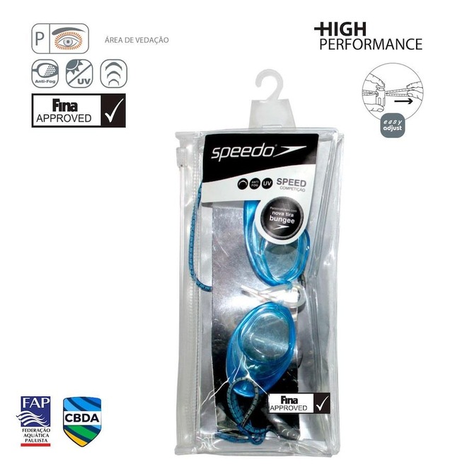 Obtenha o máximo desempenho com os óculos Speedo Speed, aprovados pela FINA para competições oficiais, desenvolvido para alta performance, em baixo perfil para menor arrasto e máxima velocidade dentro da água. Modelo tradicionalmente apelidado de ?sueco?, possui proteção na moldura para maior conforto, antiembaçante (anti-fog), proteção UV, 2 opções de narizeiras e tiras ?bungee?, preferência de atletas de alta performance, com fácil ajuste. Área de vedação tamanho P (a vedação ocorre em pequena área ao redor dos olhos).