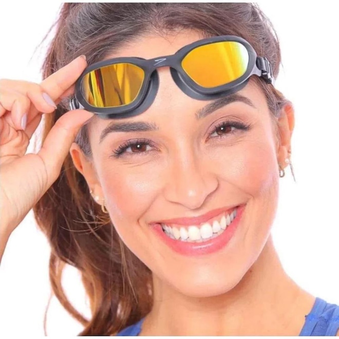Composição: - Lentes: 100% Policarbonato; - Ventosa: 100% Borracha Termoplástica; - Tira: 100% Slicone. Contém: - Óculos de Natação Espelhado Speedo Swell
