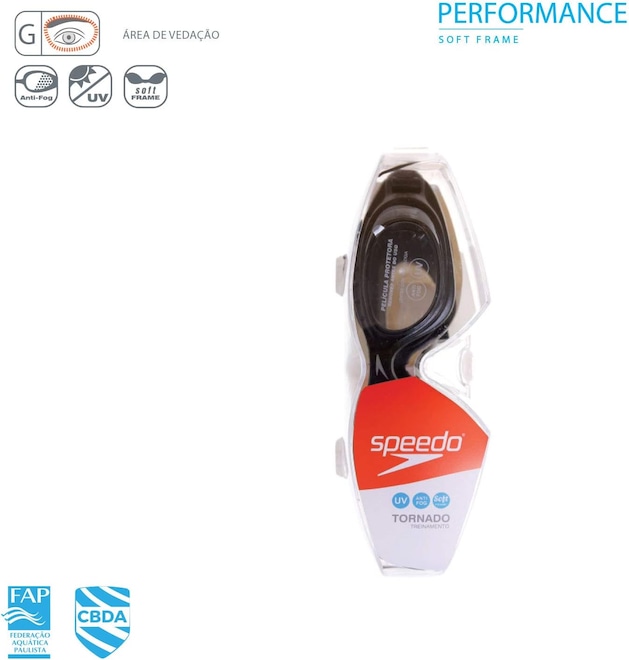 Adaptado para a maioria dos rostos, os óculos Speedo TORNADO unem conforto e resistência. Fabricados em tecnologia Soft Frame, que integra narizeira, moldura e ventosas, possui um design moderno e arrojado. Com proteção UV e tratamento antiembaçante (anti-fog), é recomendado para nadadores frequentes, que buscam melhorar seu desempenho ao nadar, sem abrir mão da durabilidade de seus óculos. Área de vedação tamanho G (vedação ocorre acima das sobrancelhas). Para escolher a lente ideal (verifique disponibilidade no modelo desejado): Cristal: Visão clara sem mudar a aparência das cores. Comum para uso em diversos ambientes. Azul: Reduz o reflexo e permite clara visão. Ideal para uso em ambientes abertos e fechados. Fumê: Reduz a transmissão de luz, diminuindo a luminosidade. Ideal para utilização em ambientes abertos. SoftFrame: tecnologia que integra ventosa e narizeira com excepcional conforto Tira repartida, de silicone, perfeita para atletas iniciantes e amadores, pela facilidade de ajuste Excelente visibilidade Lentes em policarbonato Lente com Antifog: evita o embaçamento das lentes para prolongar a excelente visão Proteção UV: Os raios UVA e UVB são reconhecidos como os mais danosos emitidos pelo sol. As lentes de nossos óculos contêm substâncias que absorvem a luz UV (390nm a 400nm). Embalagem: Elipse Box Área de Vedação: G – A vedação ocorre acima das sobrancelhas, com foco em conforto e ampla cobertura facial. Para melhor conservação, mantenha as lentes livres de poeira e gordura. Lave suavemente com água limpa e fria após o uso, deixando secar à sombra. Não esfregue ou passe pano nas lentes, para não danificá-las. Lembre-se: faça o teste de sucção antes de usar. Pressione os óculos de natação junto aos olhos até atingir o efeito de leve sucção. Se os óculos aderirem a sua face momentaneamente, indicará um bom ajuste. E os seus óculos vem com películas protetoras sobre as lentes – remova antes de usar. Atenção: exceto quando em uso, evite deixar os óculos expostos ao sol ou temperaturas muito altas. Proteja sempre as lentes dos seus óculos para evitar possíveis danos. Tratamento antiembaçante: É aconselhável a colocação dos óculos ainda secos e evitar molhar o interior das lentes, pois o acúmulo de cloro pode danificar esta propriedade, que sofre desgaste natural no uso. Para manutenção, recomendamos o uso periódico do Anti-fog Speedo nas lentes, prolongando a propriedade antiembaçante. Importante: não mergulhe na água usando óculos de natação incorretamente. Não nade abaixo de 2 metros de profundidade. Os óculos são para uso na superfície da água. Óculos de natação não protegem os olhos de lesão em caso de choque ou impacto, sempre preste atenção ao seu redor quando estiver usando. O contato com protetores solares ou produtos abrasivos danificam suas lentes. Em caso de irritação na pele, suspenda o uso imediatamente. Crianças não devem utilizar este produto sem a presença e supervisão de um adulto. Garantia contra defeitos de fabricação: 90 dias. Prazo de validade indeterminado. Os Óculos de Natação Tornado da Speedo, nas cores Ônix e Azul, são perfeitos para nadadores que buscam desempenho e estilo. Com lentes antiembaçantes e proteção UV, esses óculos proporcionam uma visão clara e segura durante os treinos e competições. O design ergonômico garante um ajuste confortável e seguro, evitando a entrada de água. Ideais para todos os níveis de nadadores, os óculos Tornado combinam funcionalidade e estética, oferecendo o melhor em conforto e performance aquática. Características Composição LENTES POLICARBONATO / VENTOSA TPE / TIRA SILICONE