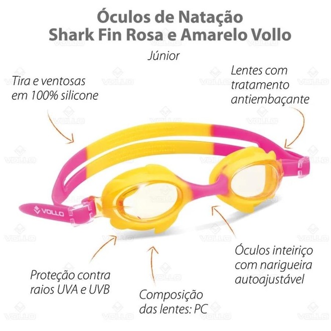Para os treinos diários de natação, os Óculos Infantil Shark Fin Vollo são excelentes aliados! Com incrível design à prova d''água, os óculos de natação garantem maior proteção aos olhos, evitando a entrada indesejada de água graças a sua vedação altamente eficaz. Com design clássico o Shark Fin, possui lentes com tratamento antiembaçante e proteção UV que proporciona ao nadador excelente desempenho durante todo o treinamento.