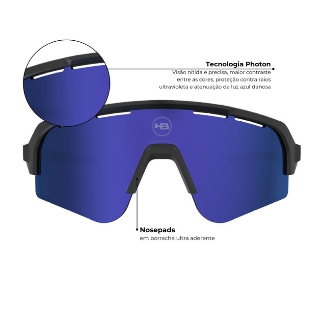 O óculos esportivo HB Edge S performance matte black Blue Chrome possui design da lente desenvolvido para melhor adaptação a diferentes formatos de rostos e exclusiva tecnologia Photon em lente cilíndrica intercambiável de policarbonato. Essa tecnologia fornece uma visão precisa, contraste das cores, proteção contra raios UV, luz azul e impacto.