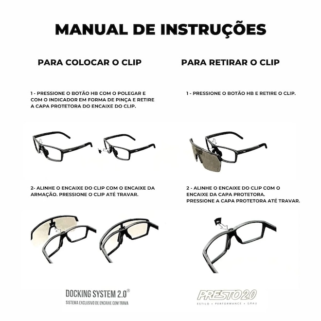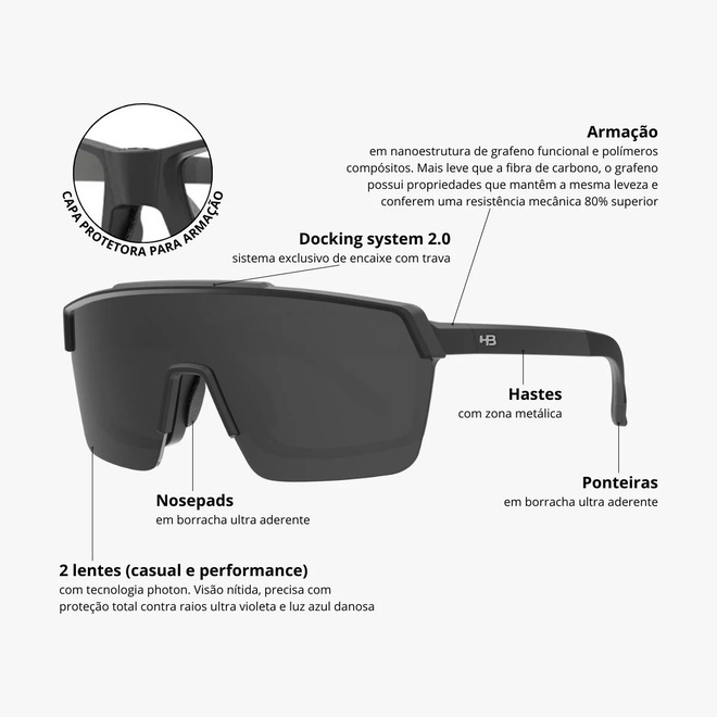 - Docking System 2.0 - Sistema exclusivo de encaixe com trava, com capa protetora para armação.