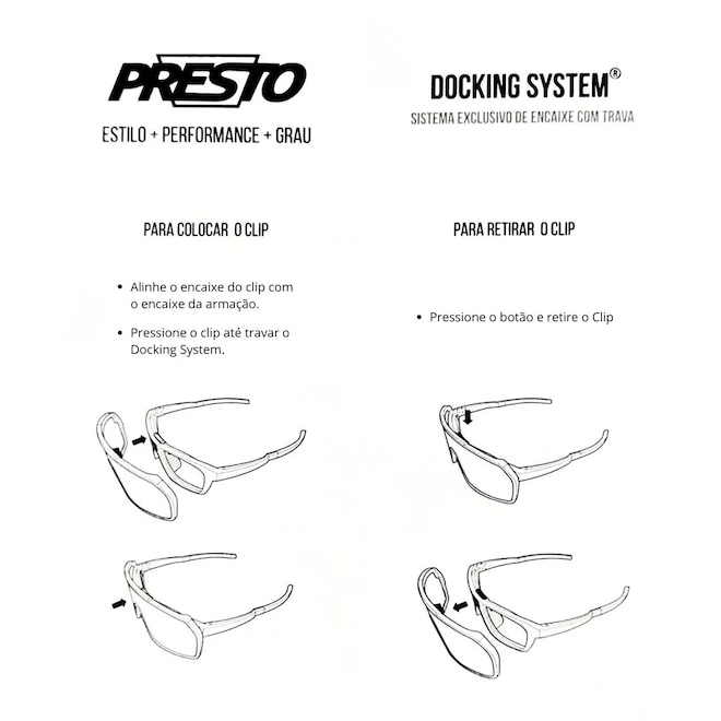 - Para colocar o clip: Alinhe o encaixe do clip com o encaixe da armaçâo. Pressione o clip até travar o Docking System.
