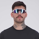 Contém: 1 óculos de sol e 1 estojo de tecido Composição armação: Policarbonato Comprimento da haste: 15 cm Peso aproximado: 30 g Largura frontal: 20 cm Indicado para: Casual Cor da lente: Azul Gênero: Unissex Origem: Nacional Tamanho único
