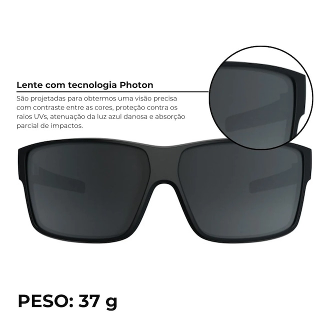 - Lente com tecnologia Photon: São projetadas para obtermos uma visão precisa com contraste entre as cores, proteção contra os raios UVs, atenuação da luz azul danosa e absorção parcial de impactos.