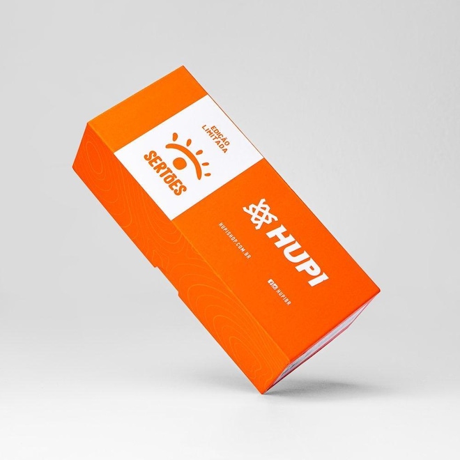 Vestida em um laranja ousado que captura a essência e a energia do Sertões, a caixa destaca-se não apenas pela sua cor intensa, mas também pela presença marcante da logo da competição, um símbolo de desafio, resistência e conquista. Sem a necessidade de desenhos adicionais, o design aposta na força da parceria e na qualidade indiscutível dos produtos HUPI, oferecendo uma apresentação que é ao mesmo tempo elegante e cheia de significado.
