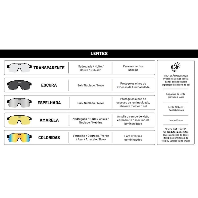 Lentes de policarbonato (PC Lens), que oferecem resistência e leveza;