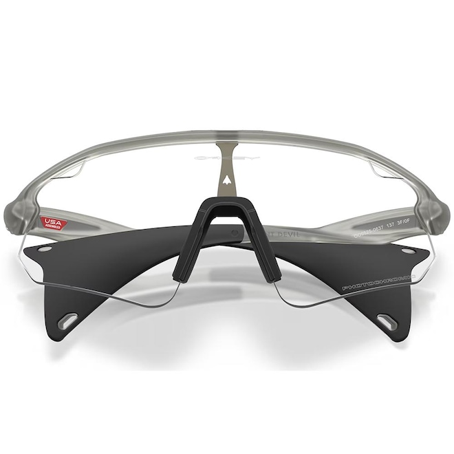 Armação em O-Matter: O material termoplástico moldado por injeção da armação da Oakley oferece maior resistência e flexibilidade em comparação ao acetato tradicional e é projetado para resistir a deslocamentos ou deformações ao longo do tempo.