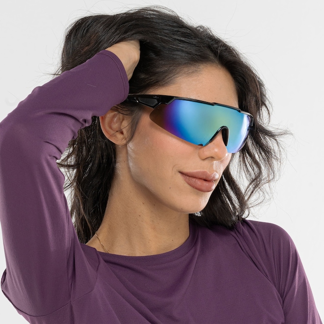 Conta com lentes espelhadas com proteção UV, que bloqueiam os raios solares e oferecem mais segurança para sua visão. A narigueira ajustável proporciona encaixe firme e personalizado, mesmo durante os movimentos mais intensos.