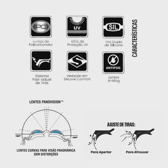 Composição: Lentes 100% Policarbonato; Tiras 100% Silicone; Vedação 100% Silicone;