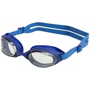O design anatômico proporciona ajuste seguro ao redor dos olhos, ajudando a evitar a entrada de água, enquanto as lentes garantem visão clara dentro da piscina.