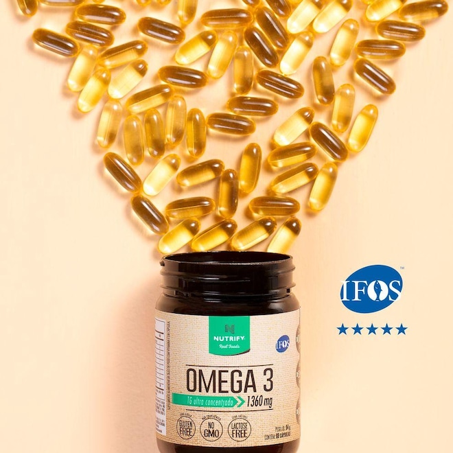 Ômega 3 Nutrify é formulado com óleo de peixe de altíssimo grau de pureza e concentração. Oferece o nutriente na sua forma de triglicerídeos - a mais biodisponível. Poucos óleos no mundo são tão concentrados: fornece 840 mg de EPA e 521 mg de DHA em apenas duas cápsulas. Certificado pelo IFOS, em virtude de sua qualidade, pureza, segurança e ausência de metais pesados.ref: M17I2V