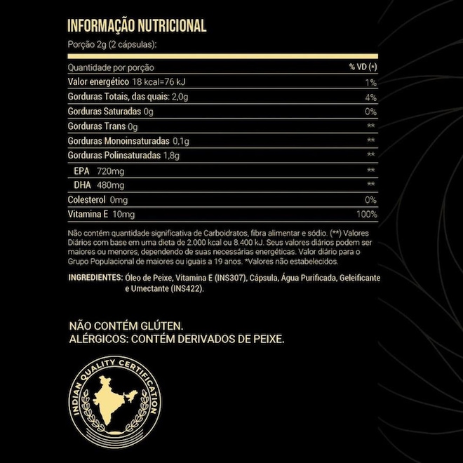 Óleo de peixe, vitamina E, cápsula, água purificada, geleificante, e umectante