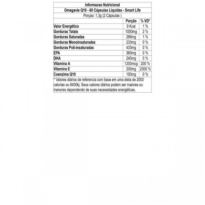 Ingredientes: Ômega 3 (Óleo de Atum), Coenzima Q10 (Ubiquinona), Vitamina E (DL-Alfa Tocoferol), Vitamina A (Palmitato de Retinol).