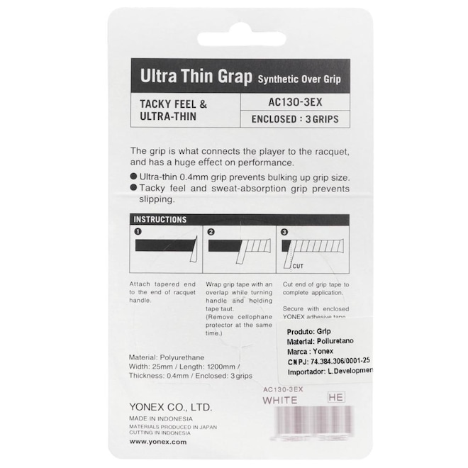 Conheça as características do Overgrip Yonex Ultra Thin Grap 0.4mm Cartela com 03 Unidades Branco
