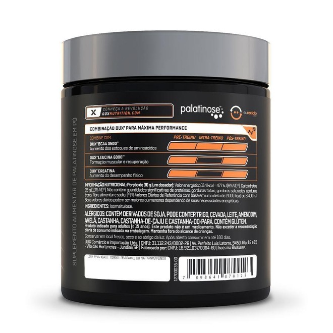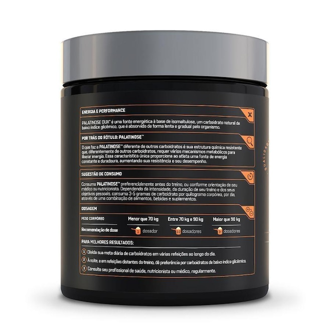 Energia Prolongada Os carboidratos são a energia do sol armazenada nas plantas, na forma de açúcares e amidos, que servem como principal combustível do corpo humano. Mas os carboidratos não são todos iguais. DUX Palatinose? é um carboidrato superior, com uma estrutura única, capaz de fornecer um fluxo constante de energia, com mínimo impacto no açúcar do sangue. Destaques da Palatinose? - Fornece um fluxo prolongado e equilibrado de energia para os músculos e o cérebro, por horas; - Eleva o uso de gordura corporal como fonte energética, poupando as reservas de carboidratos e, portanto, atrasando a exaustão; - Gera benefícios para o controle de peso e o controle metabólico, a longo prazo. Pura e Limpa, certificadamente - Matéria-prima importada alemã, pura, com procedência certificada; - Matéria-prima Halal e Kosher, rigorosas certificações que garantem práticas produtivas diferenciadas; - Produto vegano, feito 100% a partir da beterraba, sem ingredientes inferiores, corantes, adoçantes artificiais, ou substâncias ilícitas. Ideal para você Palatinose? alemã, desenvolvida por especialistas, para: - Todos que buscam escolhas mais saudáveis, e que buscam restringir o consumo de açúcares; - Atletas de esportes de alta performance em busca de energia prolongada e máximo rendimento (bodybuilding, triátlon, Crossfit®, ciclismo, corrida e powerlifting). Por trás do rótulo: Palatinose? Os carboidratos são os macronutrientes que fornecem energia ao corpo. Existem diferentes tipos deles, com diferentes características e propriedades. A isomaltulose foi descoberta na Alemanha, na região do Palatinado, e batizada de Palatinose?. Ela é obtida da beterraba, e possui uma estrutura molecular com propriedades especiais únicas.