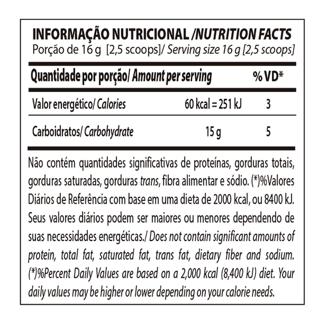 Tipo de Suplemento Carboidrato Indicado Aumento de Energia Sabor Neutro Contém Glúten Não Contém Glicose Sim Contém Frutose Sim Sugestão de Consumo Pré-Treino Cuidados de Conservação Manter o produto bem fechado.