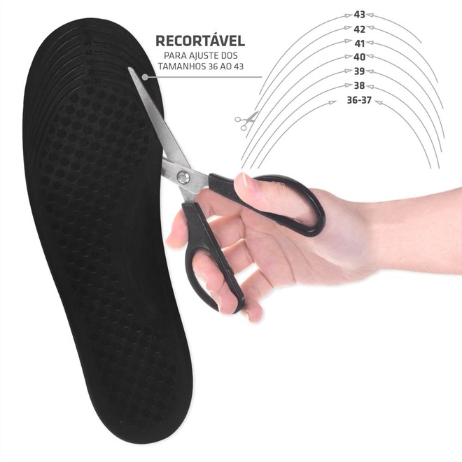 Para um melhor ajuste nos calçados, a palmilha de gel pode ser facilmente recortada para se ajustar ao tamanho desejado, atendendo dos números 36 ao 43.