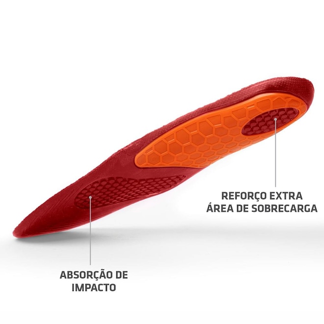 A Palmilha de Gel Performance ainda traz reforço de polipropileno, uma resina termoplástica que é aplicada na parte de baixo da palmilha na região do calcanhar, proporcionando um reforço extra para o lugar onde há maior sobrecarga do peso do corpo.