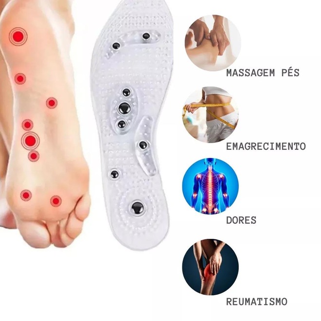 - Pode ser usada no dia a dia, para ficar em pé, correr, andar, no trabalho ou nos passeios. À medida que você anda ou fica em pé os pontos reflexos em seus pés serão estimulados pelo magnetismo, com o uso contínuo, seu corpo vai sendo ajustado para o correto funcionamento.