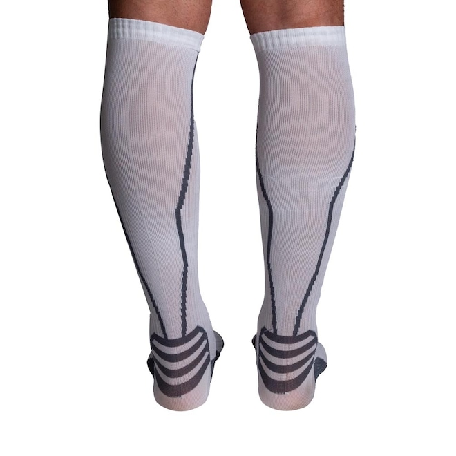 Design: Modernas e discretas, as meias apresentam cores em branco e cinza, garantindo estilo e funcionalidade. Seu design anatômico permite ajuste confortável e seguro, proporcionando suporte adicional para pés e panturrilhas.