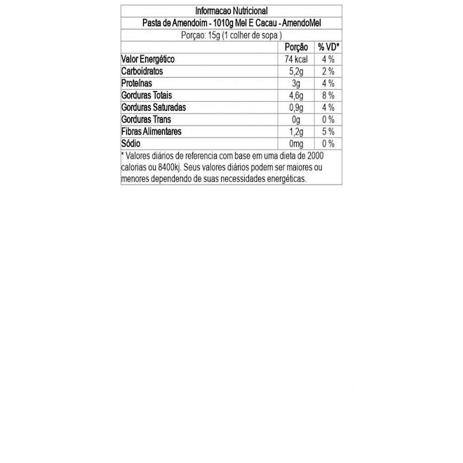 INGREDIENTES: amendoim (torrado e moído), mel, cacau em pó. NÃO CONTÉM GLÚTEN. NÃO CONTÉM LACTOSE. ALÉRGICOS: CONTÉM AMENDOIM, MEL, CACAU.