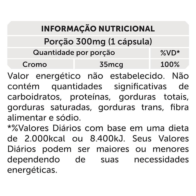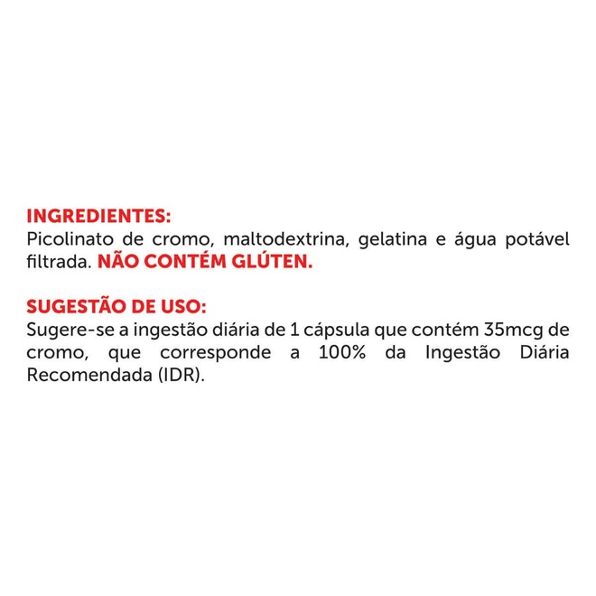 Suplemento mineral formulado com picolinato de cromo, fonte altamente absorvível pelo corpo que promove a perda e a manutenção de peso relacionadas com o metabolismo da glicose. Sua dose diária de 1 cápsula, contém 35mcg de cromo, que corresponde a 100% da Ingestão Diária Recomendada (IDR) do mineral.
