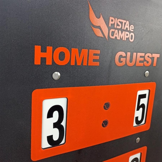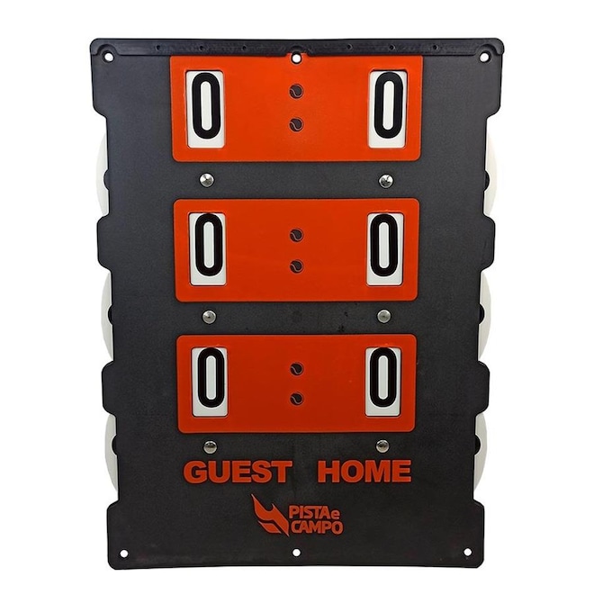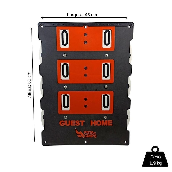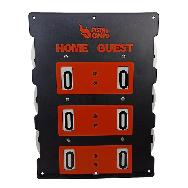 Fabricado com parafusos de aço inox. ? Ótima visibilidade à distância. ? Uso: Indoor e Outdoor. ? Marca: Pista e Campo. RECOMENDAÇÕES: ? Para maior durabilidade, ao terminar as jogadas recomendamos armazenar o placar em lugar seco e com sombra.