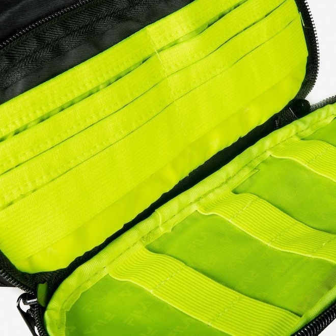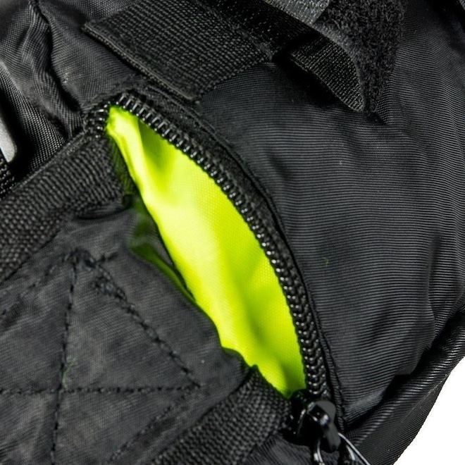 O bolso frontal com abertura total possui compartimento para ferramentas e fechamento em zíper com puxador refletivo. A parte inferior conta com looping em elástico para anexar bomba de pneu.