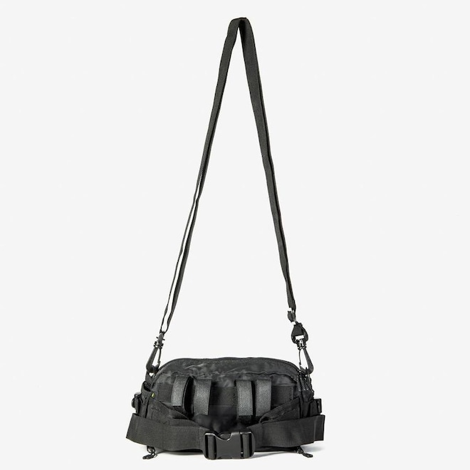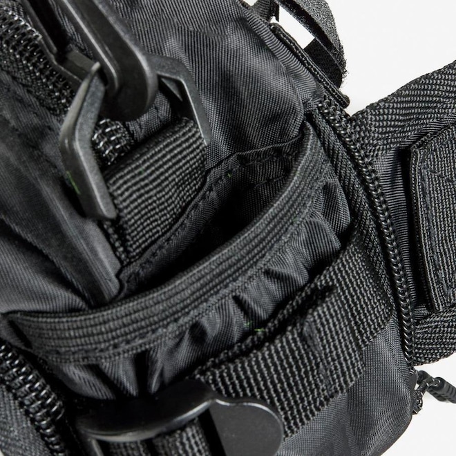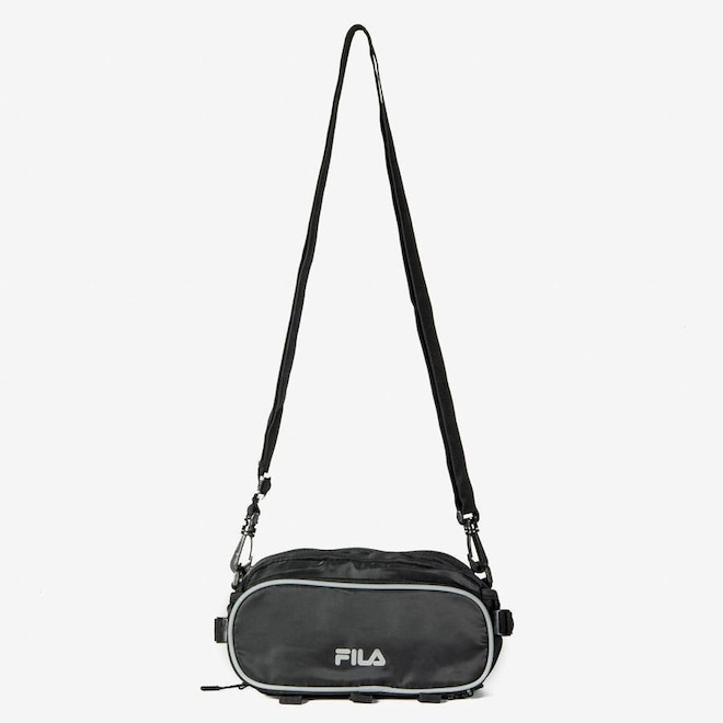 Ela possui também tiras de velcro na parte traseira para prender do guidon da bicicleta. A alça de ombro é removível, o cinto de pochete pode ser guardado na parte de trás do modelo. Detalhe e logo Fila refletivos no bolso frontal.