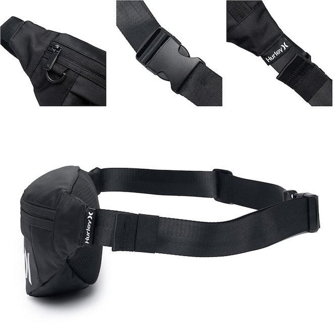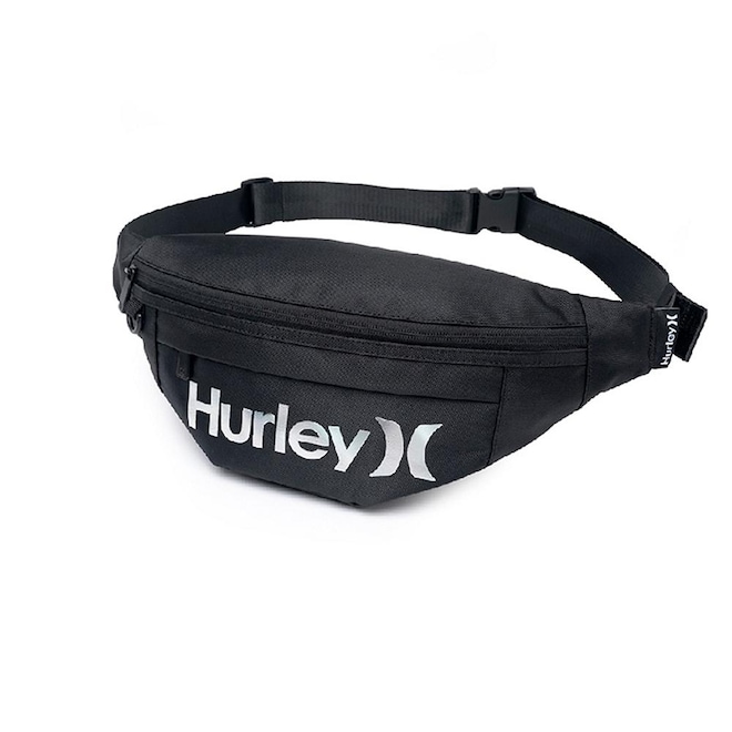Pochete Hurley com compartimento principal, compartimento frontal, alça ajustável e etiquetas personalizadas.