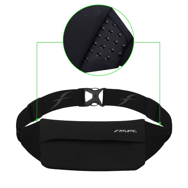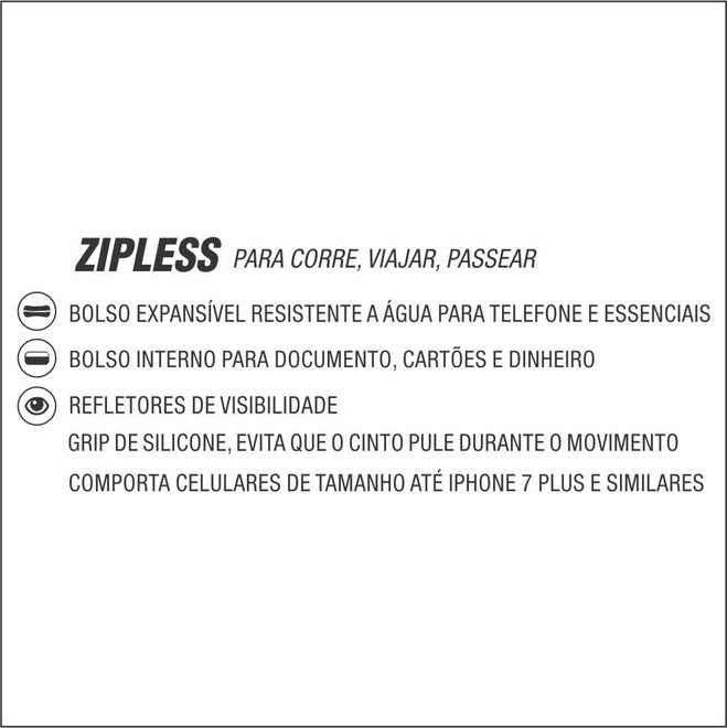 PRONTO A QUALQUER HORA! A Pochete para Corrida Zipless Fitletic Preta foi desenhada com praticidade e conveniência em mente! Você vai adorar a segurança e acesso fácil e rápido aos seus pertences no seu dia adia ou se estiver viajando. CARACTERÍSTICAS DO PRODUTO: . Bolso expansível resistente à água que guarda com segurança seu passaporte e telefone . Grip de silicone para estabilidade que evita que o cinto pule com o movimento . Cinto ultra macio com ajuste duplo na cintura Bolso interno para documento, cartões e dinheiro . Comporta celulares de tamanho até 6.7 polegadas ESPECIFICAÇÕES: Faixa flexível e ajustável na cintura: 72cm a 101,5cm Bolso: 20 cmx10 cm