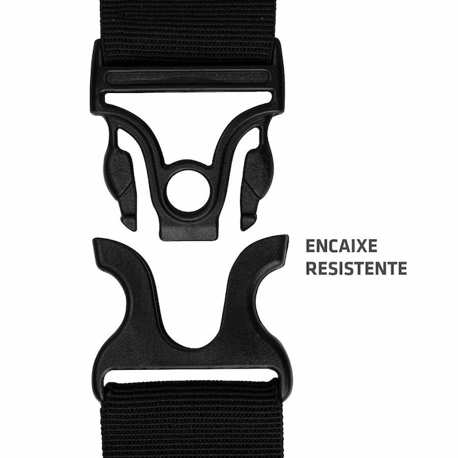 O fechamento é feito através de uma fivela em material resistente, e o compartimento para transporte é fechado com zíper para que você possa realizar suas atividades despreocupadamente, tendo a certeza que seus itens estarão bem seguros.