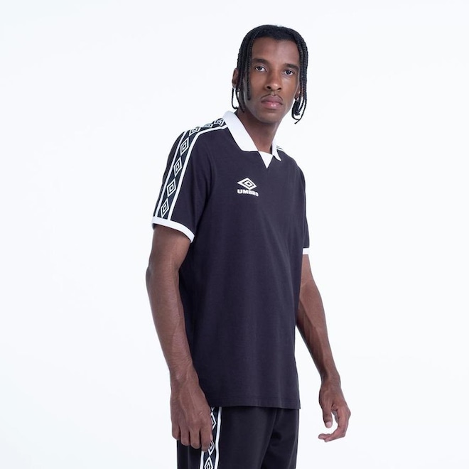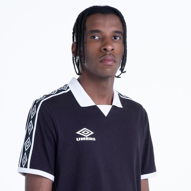 Polo masculina confeccionada em algodão. Modelagem regular com gola polo estilizada em retilínea e manga curta. Possui tape Umbro personalizado nas mangas, detalhe ?V? do peitilho em ribana na gola, punhos contrastantes e logo Umbro em silk na parte frontal direita superior.ref: M113Y1
