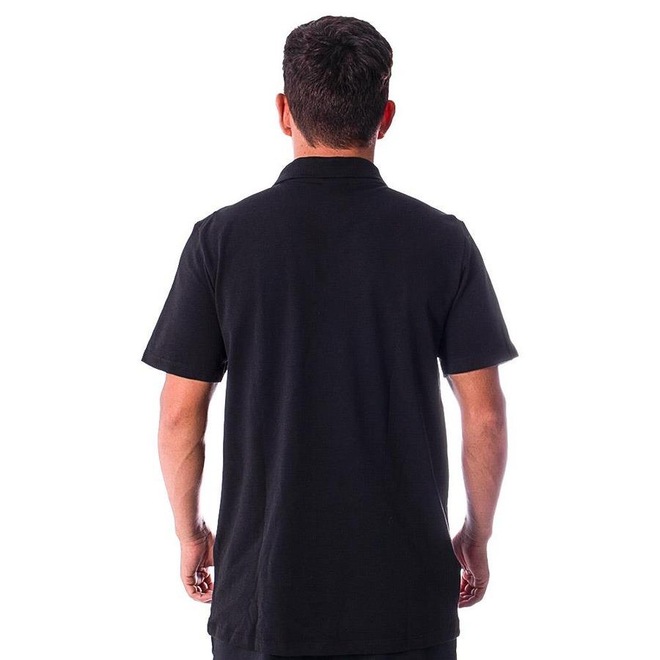 De design básico, a gola que polo que caracteriza o modelo conta com tira interna que reduz o atrito e auxilia no controle de umidade na região. É predominantemente preta, com o logo da marca fornecedora aparecendo estampado do lado direito do tórax.