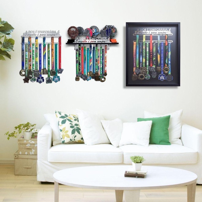 O porta medalhas é composto por 2 peças (conforme foto), a parte superior com o título + a parte inferior.