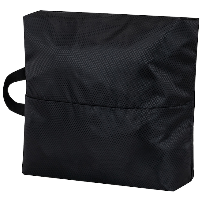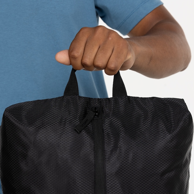 Com uma prática divisória interna, este acessório em poliéster é resistente e possui uma alça manual para facilitar o transporte.