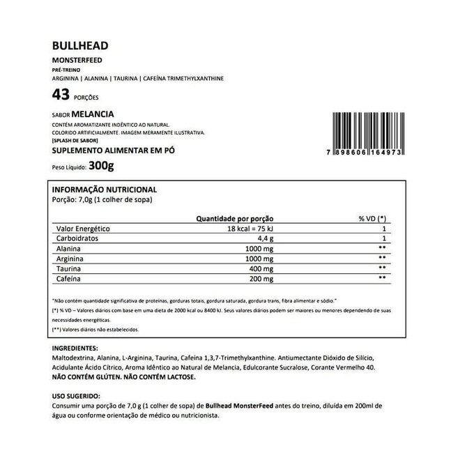 Kit Monsterfeed Pré-Treino Bullhead - Melancia - 300g + Creatina - 100g + Glutamina - 100g + BCAA - 100g + Waxy Maize - 800g