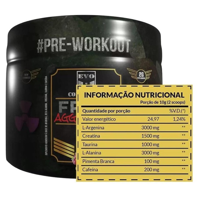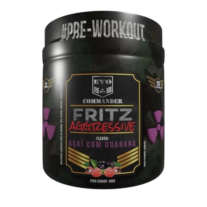 Um pré-treino com uma super concentração de ingredientes que elevará o nível do seu treino, o Fritz Aggressive da Evo Commander tem em sua composição 2g beta-alanina, 3g l-arginina, 200g de cafeína anidra e 1g de taurina.