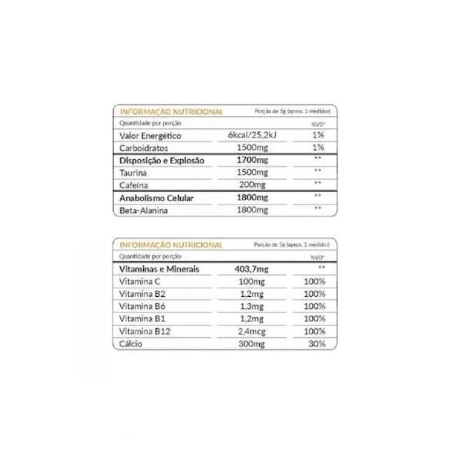 INGREDIENTES: Beta-Alanina, taurina, maltodextrina, cafeína, acidulante: ácido cítrico, aroma artificial idêntico ao natural de melancia, edulcorante: sucralose, antiumectante: fosfato tricálcico, corante bordeaux, ácido ascórbico (Vit.