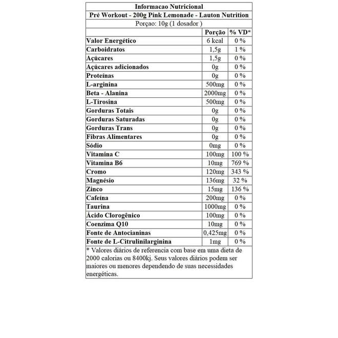 Beta-alanina, taurina, L-arginina, L-tirosina, cafeína, café verde em pó, taurato de magnésio, óxido de magnésio, inositol, pimenta preta, gengibre em pó, ácido ascórbico, extrato de laranja Moro (Citrus sinensis L. Osbeck), bisglicinato de zinco (zinco), alga Chondrus crispus invernal (fonte de L-citrulinilarginina), coenzima Q10, cloridrato de piridoxina (vitamina B6), picolinato de cromo (cromo), isomaltulose, aroma natural de chá verde, aroma idêntico ao natural, acidulante ácido cítrico, espessante goma xantana, corante vermelho beterraba, edulcorante glicosídeos de esteviol e antiumectante dióxido de silício. NÃO CONTÉM GLÚTEN.