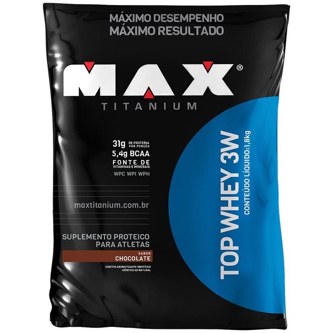 Confira o Top Whey 3W Max Titanium - Chocolate - 1,8Kg!