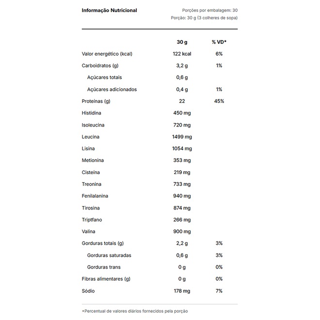 Com 22g de proteína e 3,1g de BCAA por porção, é uma escolha completa para quem busca força, recuperação muscular e uma alimentação mais consciente.