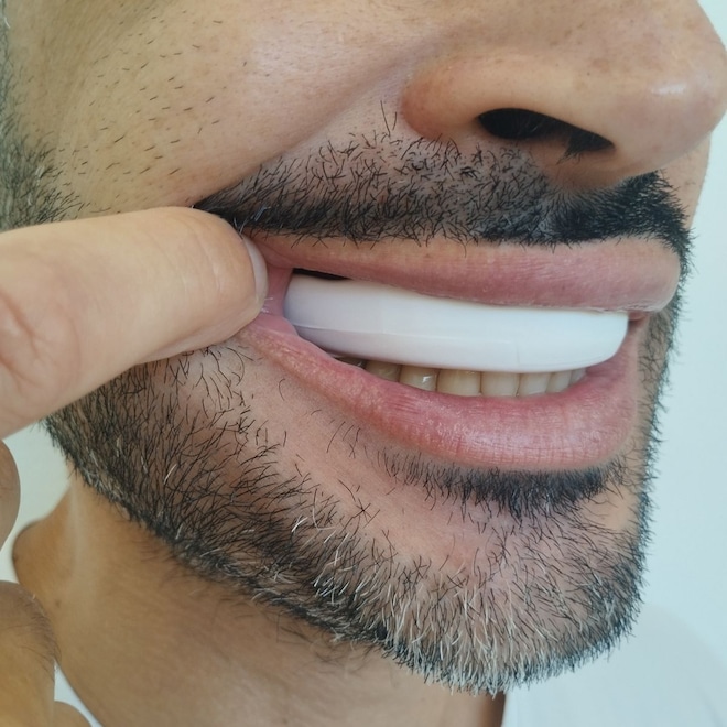4 - Coloque o protetor em torno dos dentes da arcada superior e em seguida ajeite-o com a ajuda dos dedos para pressionar as bordas do protetor bucal nos dentes e gengiva; ao encontrar a melhor posição, pressione-o por alguns segundos contra os dentes e faça sucção por aproximadamente 1 minuto, até sentir que o protetor começou a resfriar em sua boca.