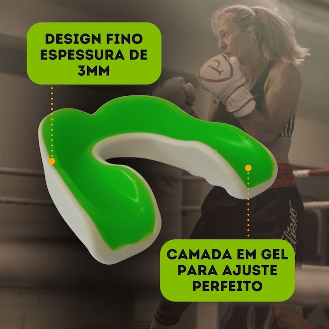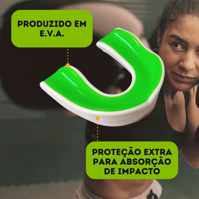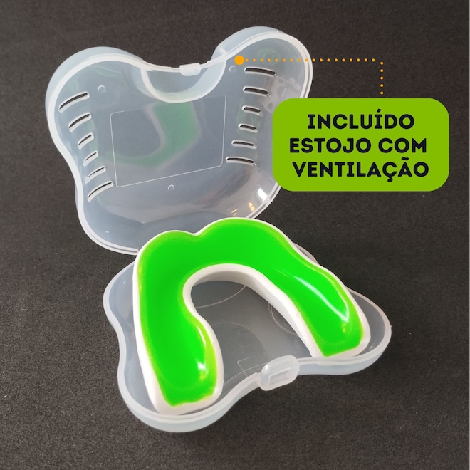 Camada externa em material EVA (Etileno Vinil Acetato), serve para absorver choques e minimizar fortes impactos. Na camada interna, forrada em gel, além da maciez, permite um ajuste personalizável de acordo com cada arcada dentária e proteção extra dos dentes.